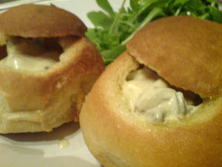 Now hollow out 2 bread rolls by first slicing the top off and then scooping out the centre, making sure you don’t make any holes in the side. Brush the lid and roll inside and out with melted butter – about ½ an ounce – and bake for 10 minutes until crisp and golden.
