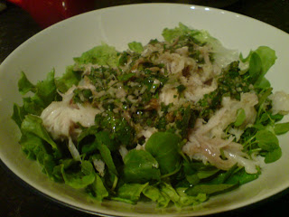 Another fish dish. Skate is one of my favourite fish and liked the idea of having it in warm salad – perfect for this time of year when the weather is often bright and sunny but will a chill still in the air. Classically, skate is poached or fried and served with either a beurre noisette or capers, so I thought having it in strips with warm vinaigrette would be a new thing that might jazz up this tasty, though bland, fish.