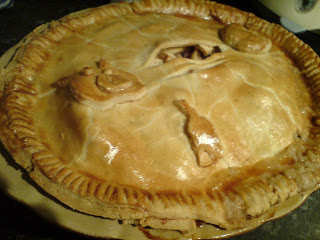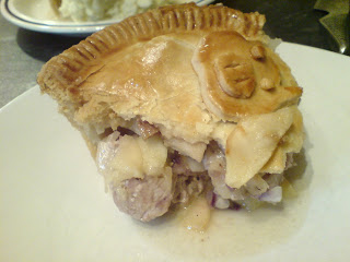 To make the filling you need to prepare your pork – you need 2 pounds of boned pork loin. Cut off the rind and trim away the fat with a sharp knife, then slice the loin and chop into chunks. Next peel, core and slice around 12 ounces of Cox’s orange pippins. Then mix 8 ounces of chopped onion together with 4 chopped rashers of cured, unsmoked bacon. Now layer the ingredients in the pie dish: half of the pork, then half of the apples, scatter them with some brown sugar and then sprinkle over half of the onion-bacon mixture. Season each layer with salt and pepper plus some grated nutmeg. Repeat with the remainder in the same fashion. Dot the top with around 2 ounces of butter and then pour on ¼ pint of dry cider. Cover with the remaining pastry sealing and glazing it with beaten egg. Make some fancy pastry decorations if you fancy. Bake for 20 minutes at 220°C, and then turn the oven down to 160°C for a further 45 minutes. Jane doesn’t indicate what to serve with it, but I went with mustard mash and some asparagus.