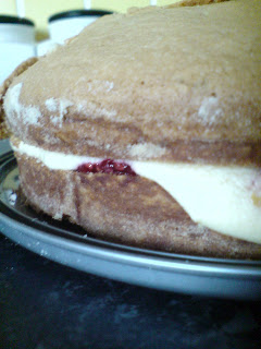Cream 4 ounces of butter with 8 ounces of caster sugar and beat in three eggs one at a time. Stir in 8 ounces of rice flour and the grated zest of a lemon. Pour the mixture into a greased and floured 7 inch cake tin and bake at 180⁰C for anywhere between 50 minutes and an hour and a half. Jane doesn’t say to fill it with anything, so I used raspberry jam and Butter Cream I.