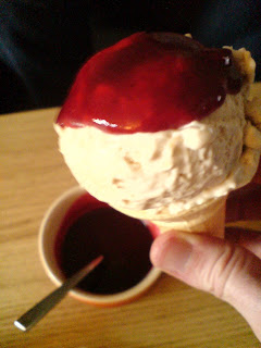 Griggers suggests serving it with almond biscuits, but I went one better – I served them in ice cream cones with home make monkey blood (that’s raspberry sauce to you).