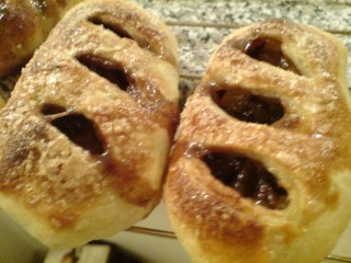 While you’re waiting, roll out some puff pastry thinly and cut seven inch wide circles. Put a spoonful in the centre of the circle in line about five inches long, drawing and folding in the pastry, pinching in the edges. Turn them over and flatten them slightly with the rolling-pin so that you have oval shaped cake. Make three slashes over the top, brush with egg white and then sprinkle with sugar. Bake for 15 minutes at 220°C (425°F). Allow to cool on racks.