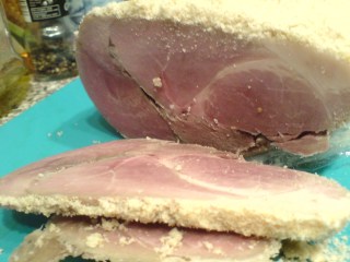 You can use leg or loin for this. I have already gone through how to prepare and boil the salt pork or ham in a previous post. When it is cooked remove from the stock and allow it to drain and cool down enough for you to remove the skin without scolding yourself. If the meat has been deboned, then it needs to be wrapped in cling-film and pressed overnight (as I did). Toast some breadcrumbs and press them into the meat. This will be easier if the meat is still warm, though if you had to press it, there is no open than to do it when it is cold. Keep the whole thing wrapped up in clingfilm or greaseproof paper in the fridge and slice it up thinly for salads and sandwiches.