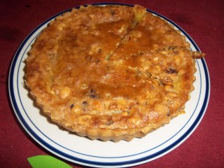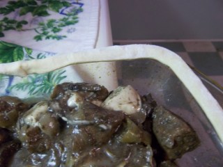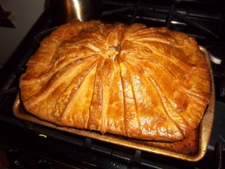 Place it on a baking tray and bake the pie at 220°C (425°F) for 20 minutes and then turn the heat down to 180°C (350°F) and bake for another 2 hours. If the pie is browning too much, cover it with brown paper to protect it. If the pie bubbles ferociously, then turn down the heat again to 140-150°C (275-300°F). Loads of fat comes out the central hole, hence the precaution of the baking tray. I had to empty it twice during the whole process. I reserved it for making roast potatoes in the future, of course.