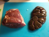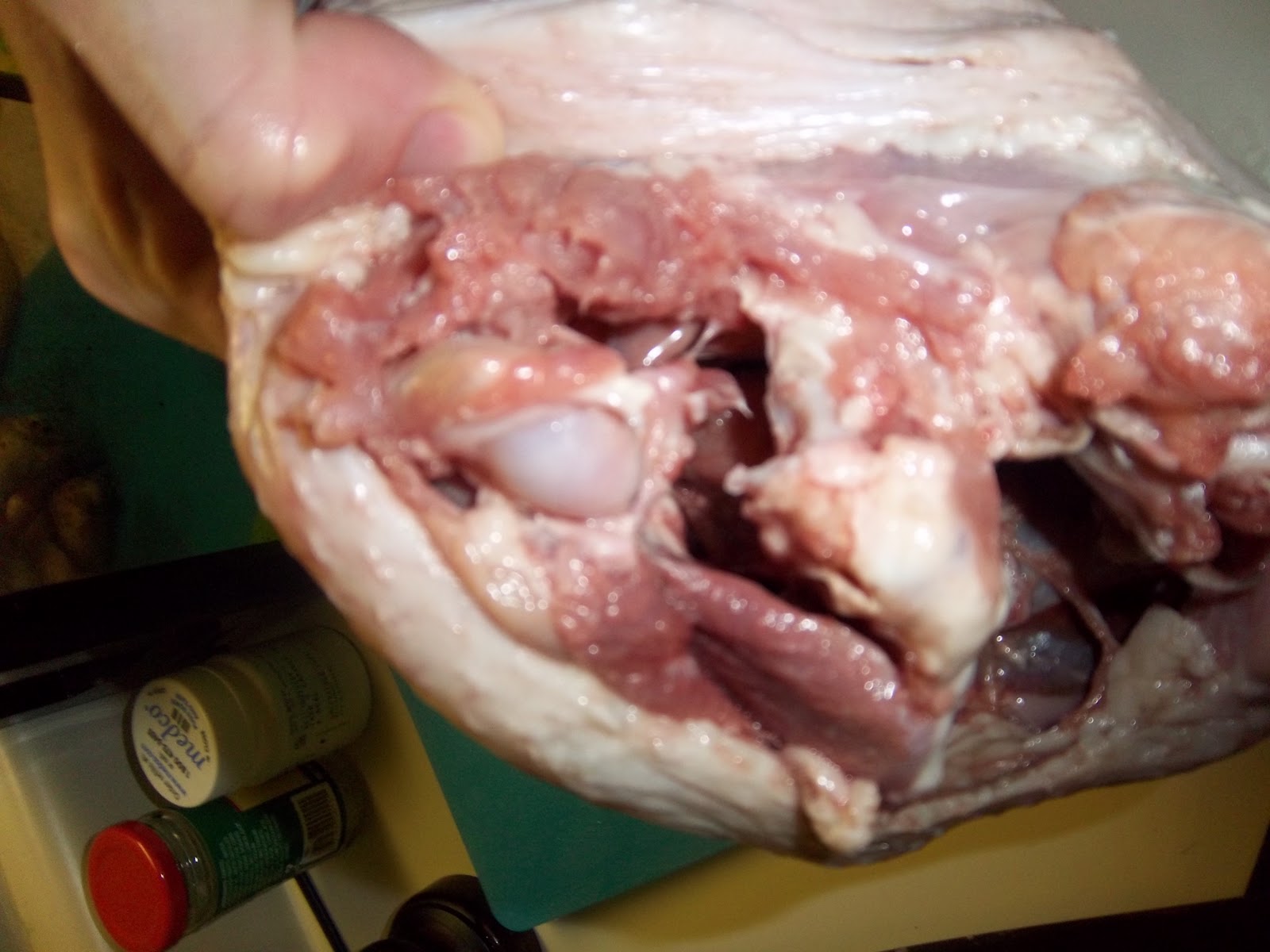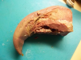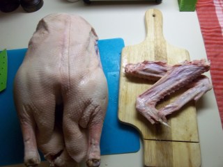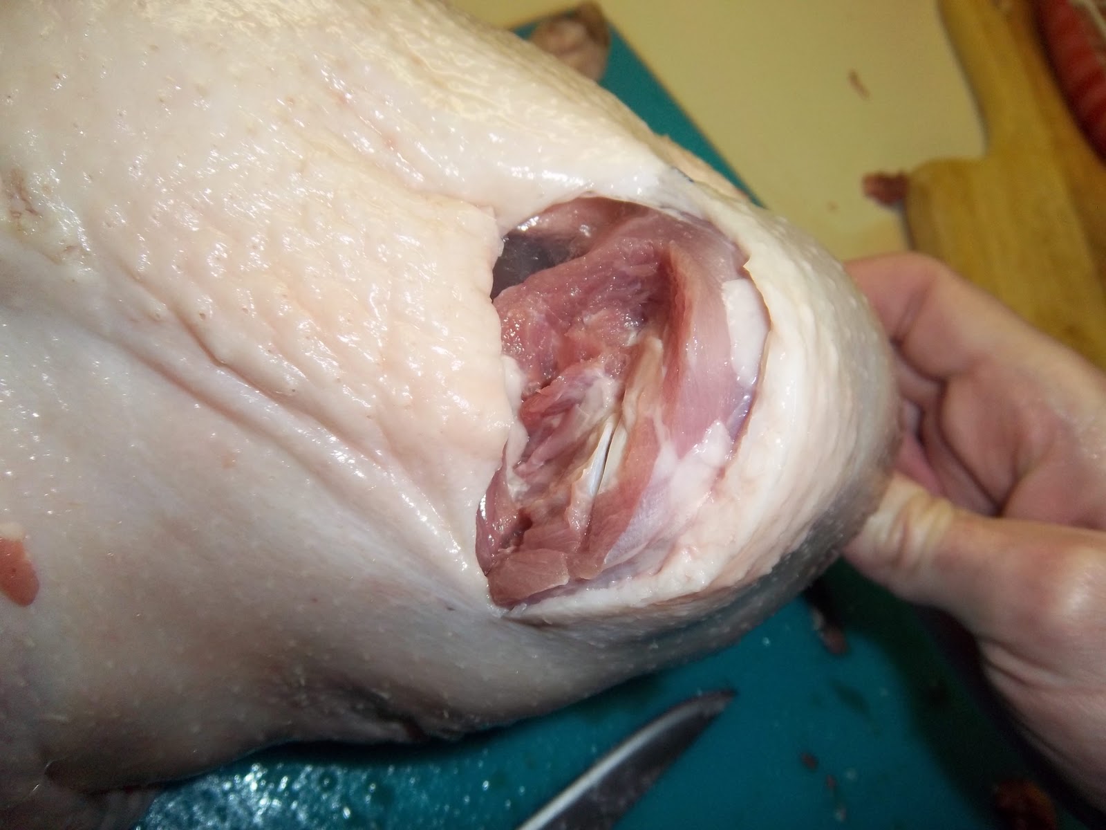 There is a certain amount of preparation required if you are to do this from scratch. The first thing is to pickle an ox tongue in brine (see here for instructions) and cook it (see the recipe here for making pressed tongue; there is no need to press it). You need 2 ½ pounds of cooked tongue, so start with one that weighs at least 3 pounds. Next is the birds: you need a 10 pound goose and a 5 pound chicken. If you can, ask the butcher to bone them for you, if that is not possible, try doing it yourself – all you need is a bit of patience and some good sharp knives. I followed the method on this website for boning a chicken, but had to change the instructions somewhat for the goose as it is much trickier than a little chicken. So here’s a little digression as I give you my version…