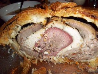 #322 To Make a Goose Pye. What a spectacle this pye was – especially when sliced up. I expected it to be rather macabre, but it wasn’t. It was indeed a ‘pretty little side dish’. The meat inside was wonderfully moist and a good jelly had formed inside without the need for jellied stock. Some people were a little suspicious of the tongue, but everyone seemed to like it. The only problem – though others disagreed – was that it was rather under-seasoned for me; with an extra 50 per cent salt, pepper and mace, this very, very good pye would have been excellent. 8.5/10