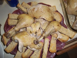 This recipe asks for the capon to be gently simmered just like the turkey with celery sauce I made last November. It is served with a bread sauce that is seasoned with the verjuice and some oyster liquor, though no oysters are actually used in the recipes themselves. I was hoping I could buy some liquor in jars just as you see clam liquor in the supermarkets. I am sure clam juice would be a good substitution, but as I am cooking the recipes as given, I must use oyster. (It turned out well in the end, as it gave me the perfect excuse to make some angels on horseback – look here for my recipe.)
