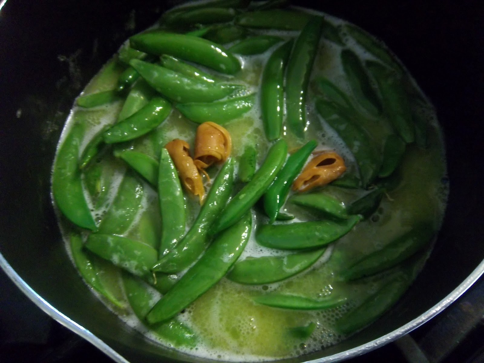 The sugar peas – ‘cods’ – can be prepared whilst the capon is resting. When the cods be but young, string them and pick off the husks. Take 2 or 3 handfuls and but with ½ sweet butter, ¼ pint of water [this equalled 4 fluid ounces back in the day, rather than 5 as it does today in the UK], gross [black] pepper, salt, mace and oil. I used olive oil. Heat all the ingredients aside from the pods in a saucepan, add the pods, cover and stew until tender but with a little bite left in them.