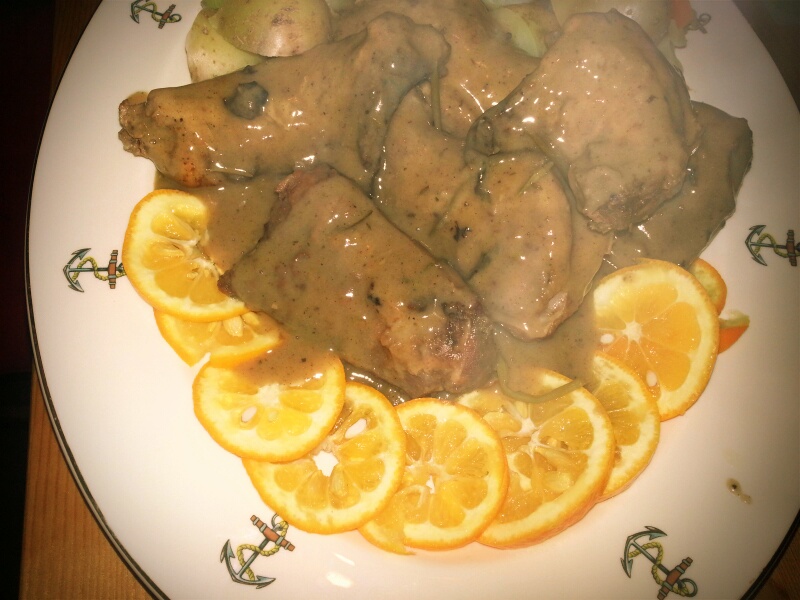 Arrange the pieces of rabbit on a warmed serving dish with the orange slices arranged around it. Lastly, pour the sauce over the rabbit and serve it nice and hot.