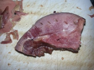 First of all you need to tackle your pickled ox tongue – you can buy these from your butcher pretty cheaply as I did this time, but you might want to have a go. I usually do this but the butcher didn’t have any fresh (which is understandable seeing as very few people buy them nowadays). Have a look at the post #150 How to Cure Meat in Brine for some guidance on this. Once pickled, you need to poach your tongue for 2 to 3 hours and then peel it. You don’t need to press it or anything, but see #258 Boiled Ox Tongue: To Serve Coldand #331 Boiled Ox Tongue: To Serve Hotfor more information on this.
