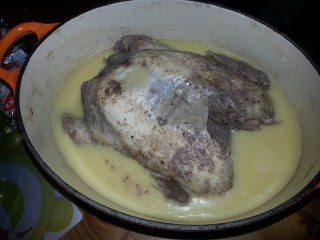 Put on the lid and bake in a low oven – 120-140⁰C (250-275⁰F) for at least 90 minutes. It is best to let the rabbit cool in the oven then reheat it the next day – this will produce nice tender rabbit – alternatively cook for another hour or two at that very low setting.