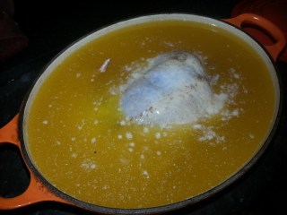 When cooked, gingerly take the chicken out so it can drain on a rack and pour the butter and meat juices into a bowl. Let everything cool before boiling the butter up in a pan – however, make sure none of the juices go in. Put the chicken back in its pot and tip over the butter.