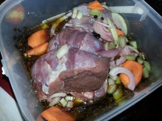 To make the uncooked marinade slice up a carrot, two onions and a stick of celeryand place in a bowl or tub along with a bottle of red wine – ‘respectable and decent rather than glorious’ – four fluid ounces of red wine vinegar, a bouquet garni, a dozen of both peppercorns(lightly crushed) and allspice berries, and finally four fluid ounces of olive oil.