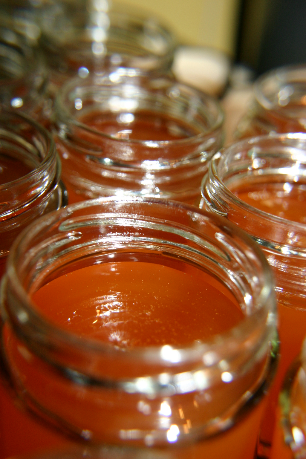 Normally, the apples alone have enough pectin in them to easily set a jelly like this, but the chilli peppers somehow interact with the pectin and prevent it from happening. To get around this problem you need to add extra pectin which comes in the form of a viscous liquid or a powder. Grigson suggests using 3 fluid ounces of liquid pectin (e.g. Certo), but you could use a sachet of pectin powder in its place. Whichever you use, mix it well into the boiling jelly. Test for a set using a thermometer; 104⁰C is what you are looking for. This will take about 10 or 15 minutes of hard boiling. It is important to note that you shouldn’tfollow the instructions on the packet. Pot the jelly into sterilised jars.