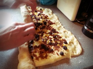 Melt 2 ounces of butter and brush the dough with it, then sprinkle 3 ounces of dark brown sugar evenly over that. Finally, scatter with 3 ounces of raisins and 2 ounces of candied orange peel. Make sure everything goes right up to the edges of your dough. Now start to roll it up; start at one far corner and carefully fold the dough over along the long side.
