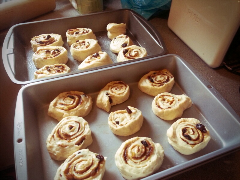 Grease one large or two medium tins and arrange the buns inside, leaving a gap of about half an inch between them and the sides of the tin. Brush with some beaten egg, then cover with a damp cloth so that they can prove for 20 to 30 minutes until the coils are just touching. Bake for 10 to 15 minutes at 230⁰C (450⁰F). While the buns are baking, make a bun wash by boiling together 5 tablespoons of water and 2 ounces of sugar until syrupy. When the buns are ready, the edges will be well-joined and the tops nicely browned. Brush over with the bun wash and sprinkle over some crushed up sugar cubes if liked.
