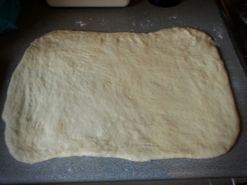 Knock back the dough, stretch and roll it into a rectangle of approximately 12 inches by 18 inches so that it is set out before you like a landscape and not a portrait painting.