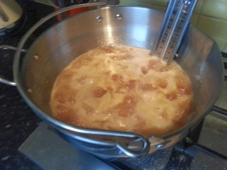 Start off by browning a pheasant in 3 ounces of butter along with a chopped onion in a frying pan. Place the pheasant breast side down with the onions in a casserole dish. Cut three strips of unsmoked bacon (aka green bacon) into thin strips and fry that in the pan briefly. Deglaze the pan with ¼ pint of port and a batch of giblet stock. See the now positively ancient post #122 Roast Pheasant for instructions on how to make some. Pour the stock, port and bacon into the casserole dish, cover tightly with a double layer of foil. Bake in the oven for 30 minutes at 180⁰C. At this point the legs of my pheasant stuck right out all flexed. At least there would be good handles when it came to the drumsticks.