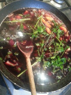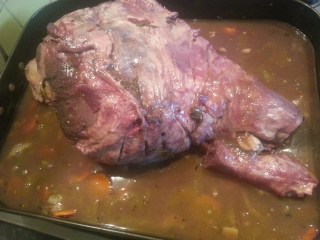 Spread the vegetables over the base of a deep roasting tin, place the leg on top and strain the marinade over it. Top up the marinade liquid with veal stock so that it comes up two-thirds of the way up the tin. You don’t actually need to use veal stock; chicken stock or water would do, I am sure. However, if you want to make your own, look here for my recipe for it from the other blog). Cover with more foil.