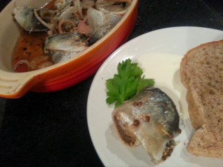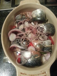 If you don’t want to serve the herring in their baking dish, move them to a more suitable serving dish and sieve over the pickling liquor.