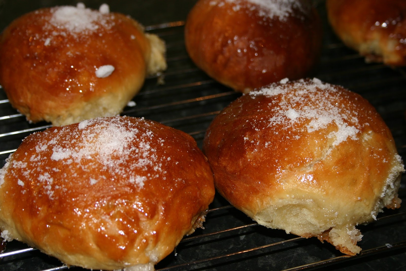 When almost baked, make the bun wash by boiling together 2 ounces of sugarwith 5 tablespoons of water. As soon as the buns come out of the oven, place on racks and brush with the syrupy mixture. Lastly, crumble over more broken sugar lumps.