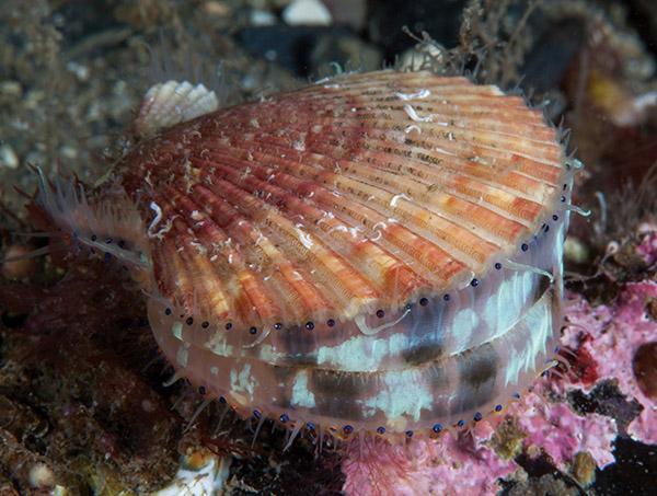 A smiling scallop with its many tiny black eyes (from divernet.com)