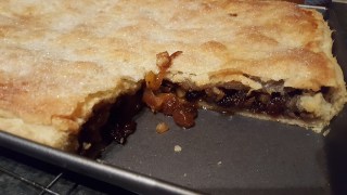 Now it’s time to layer up the filling ingredients. Start with a good covering of raisins or currants (10 ounces) and then 4 ounces of candied mixed peel. Peel, core and grate a medium-sized cooking apple and scatter that over the mixed fruit. Next, melt 5 ounces ofbutter in a saucepan, remove from the heat and add 4 ounces of pale or dark soft brown sugar (when given the choice, I always go for the latter), 5 tablespoons of rum, a teaspoon of ground allspice and half a teaspoon each of ground cinnamon and mace. Beat them all together and pour evenly over the fruit.