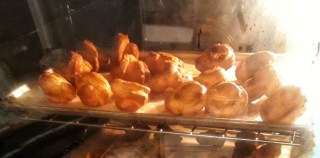 Once they are good brown colour, remove them from the oven and cut a slit or make a hole in their bottom with a skewer. Tip them on their side, return them to the oven and turn the heat down to 120°C so that the steam that puffed them up can escape to create a nice crisp interior. Cool on a rack.