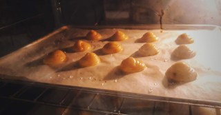 If your piped pastry has little spikes, press them down with a wet finger so they don’t burn and carefully drip on the tray (don’t sprinkle water on the pastry itself though).