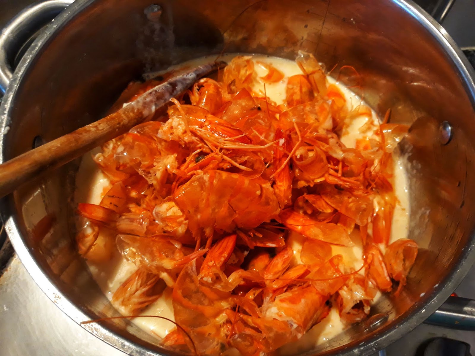 Remove the meat from whatever shellfish you are using and refrigerate it. If using large prawns, as I did, don’t forget to de-vein the blighters. If using crab or lobster don’t forget the precious brown meat and roe (if any).