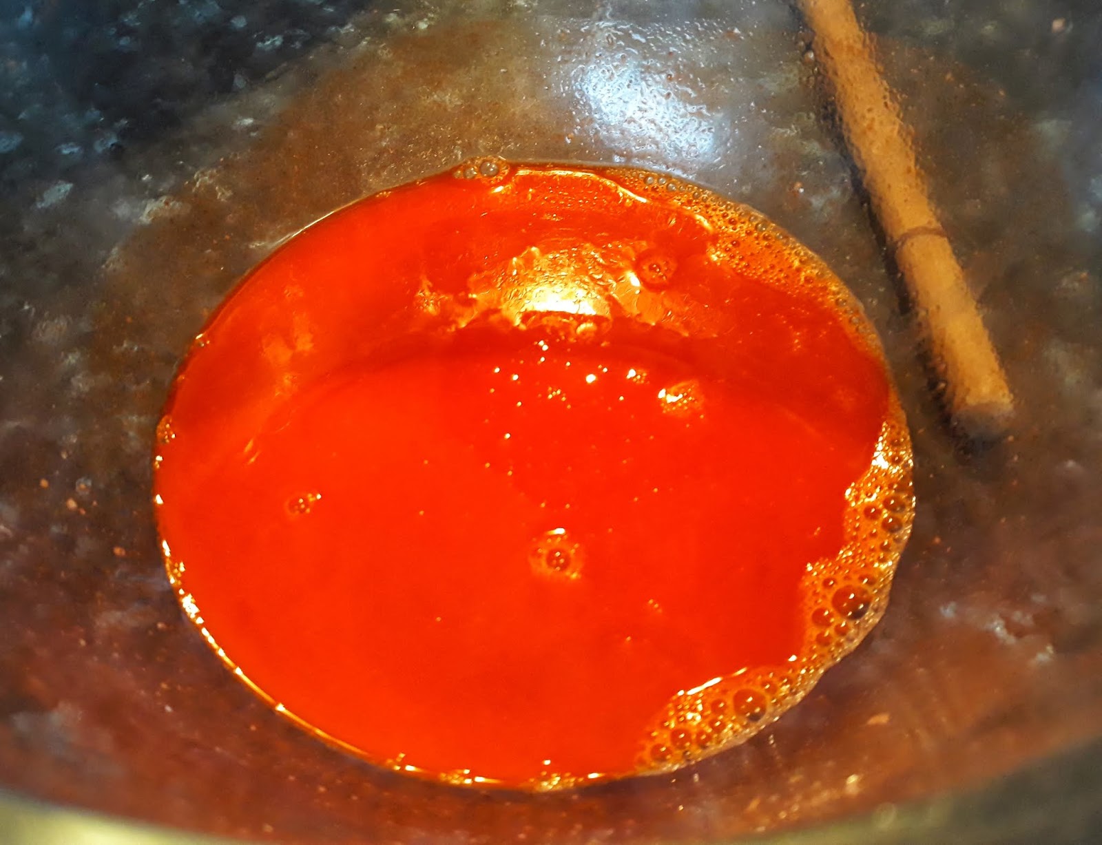 Add the shells to the sauce and allow the sauce to simmer away for 15 minutes. Loads of flavour comes out of the shells, and the sauce turns a beautiful salmon pink colour. Sieve ‘energetically’, says Jane, so I strained the whole thing through a conical sieve, pushing down hard with the underside of a sturdy ladle.