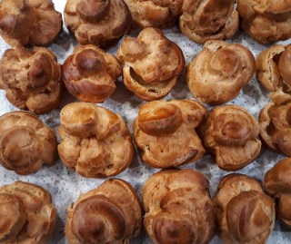 Prepare some baking trays by lining them with greaseproof paper. Now it’s time to pipe the pastry – Jane gives no indication as to how many we need or what size they should be. I scooped the paste into a piping bag fitted with a large round nozzle and made mounds around 1 inch in diameter. It’s important to raise the piping bag as you dispense the dough so your paste is very domed – you get a better and larger puff that way.