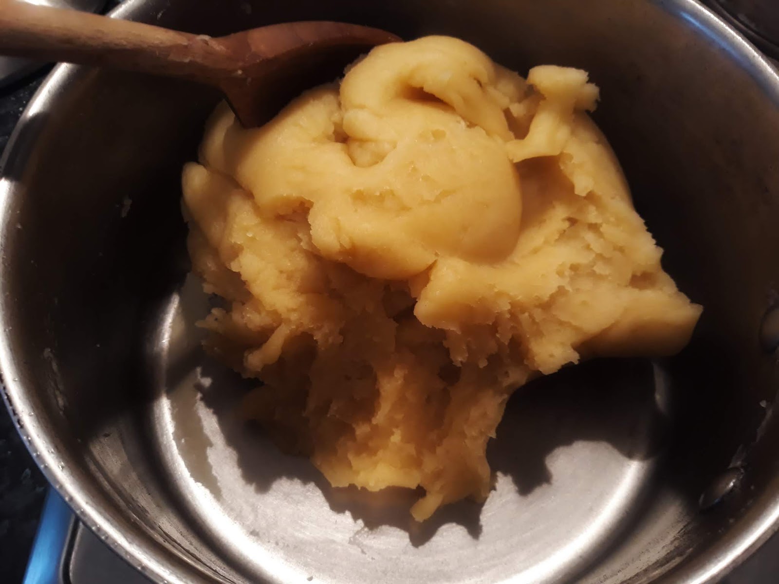 Let the mixture cool for 5 minutes and beat in 4 eggs one by one, waiting for the previous one to become fully incorporated before adding the next one. Use an electric stand mixer for this if you can, otherwise and electric hand whisk. The dough can be used straight away or covered and cooled and used later.