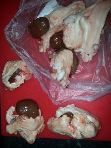 Then, ‘[r]emove the bird and allow to cool. Skim as much fat as possible from the juices [I found there were barely any juices so and I had to add a little hot water to dissolve the delicious dried juice deposits], pour the rest into a glass and leave to cool. When the chicken is cold, cut away the meat and slice it up.’