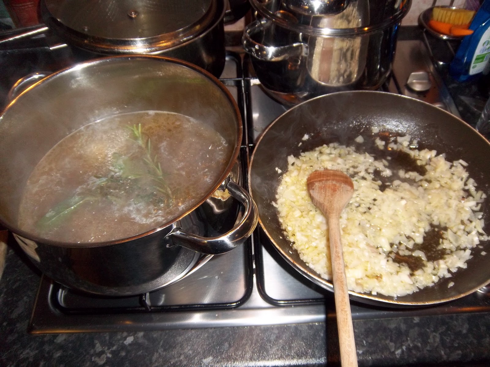 Use the carcasses to make ¾ pint of game stock. Melt 2 ounces of butter in a pan and cook 3 chopped shallots until soft and golden. Now stir in a heaped tablespoon of flour and whisk in the hot stock a third at a time to prevent lumps forming.
