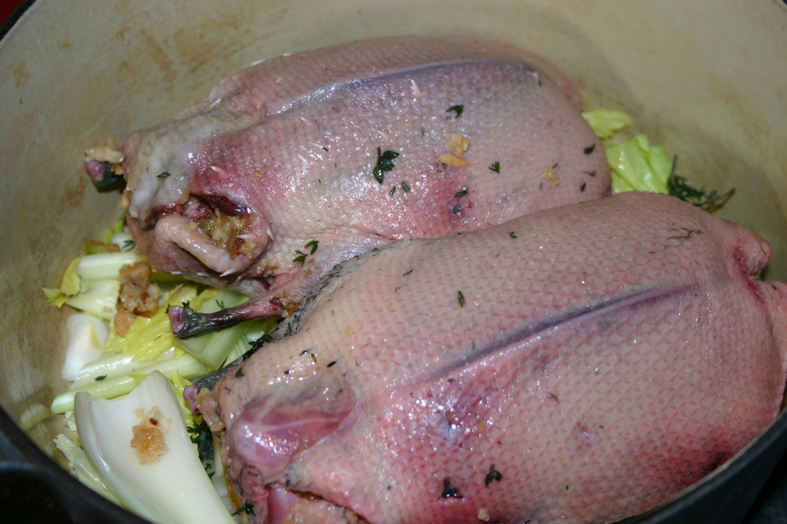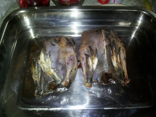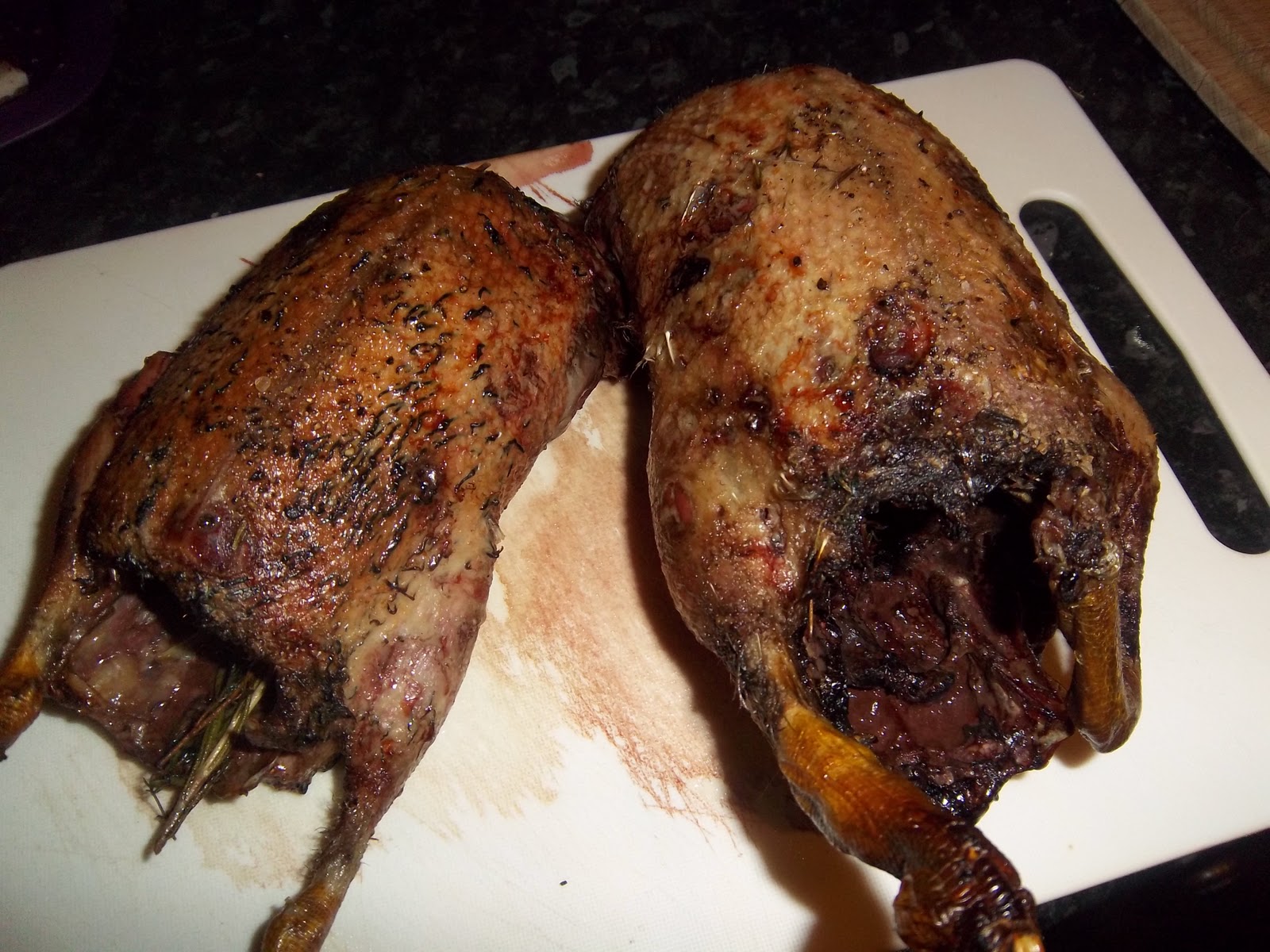 So that is exactly what I did. They were browned in a cast-iron casserole and covered in a quarter of a pint of chicken stock and a good slug of port, along with some salt and pepper and some pared orange peel and popped them in a 160°C (325°F) for 20 minutes. I then took them out to rest and used a beurre manie (i.e equal weights and butter and flour mashed together) to thicken it. I served it not with the usual game accoutrements (bread sauce, game chips etc), but mashed potatoes and some wilted spinach.