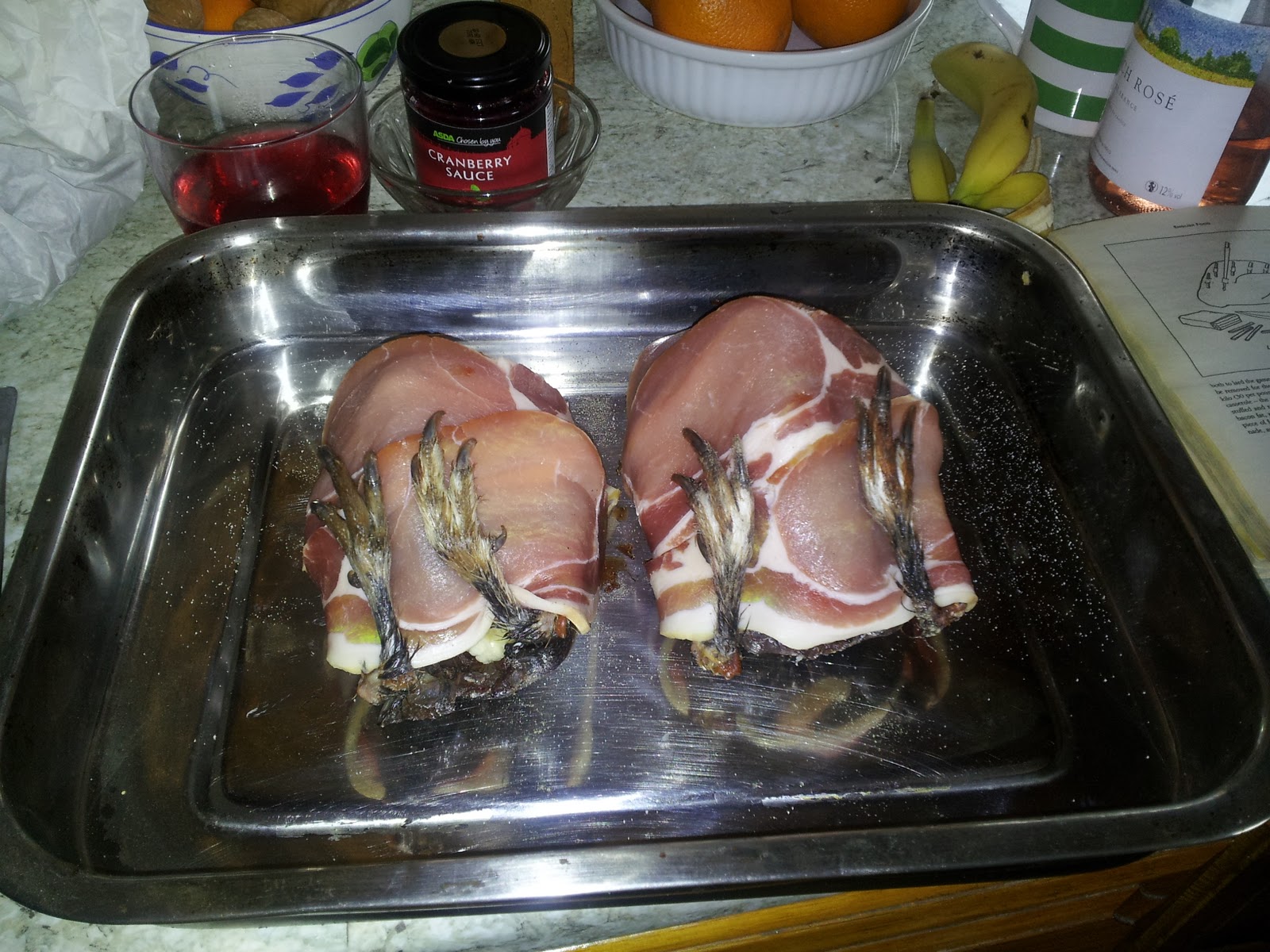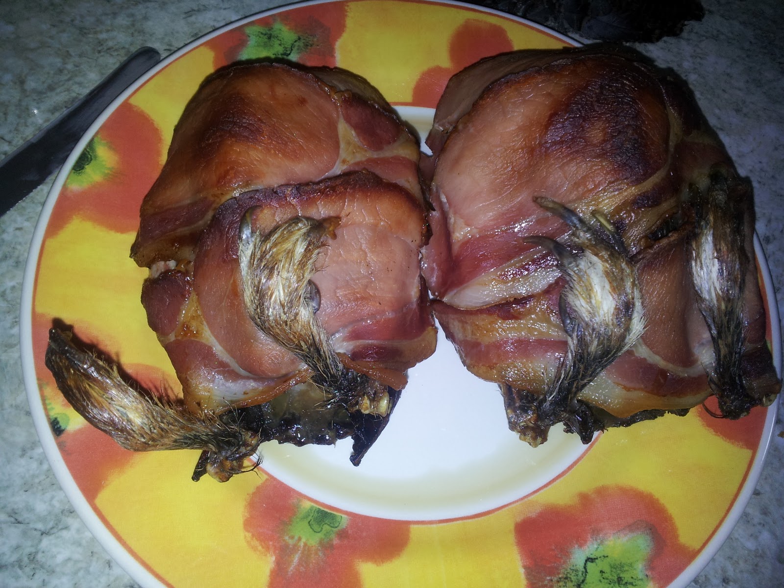 Cover the birds with vine leaves if you can get them. This is not necessary, so don’t worry if you can’t find any (I couldn’t). Next, cover the birds in jackets made of either bacon rashers or a sheet of pork back fat.