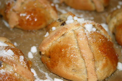 When almost baked, make the bun wash by boiling together 2 ounces of sugarwith 5 tablespoons of water. As soon as the buns come out of the oven, place on racks and brush with the syrupy mixture. Lastly, crumble over more broken sugar lumps.