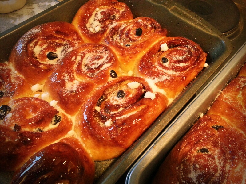 Grease one large or two medium tins and arrange the buns inside, leaving a gap of about half an inch between them and the sides of the tin. Brush with some beaten egg, then cover with a damp cloth so that they can prove for 20 to 30 minutes until the coils are just touching. Bake for 10 to 15 minutes at 230⁰C (450⁰F). While the buns are baking, make a bun wash by boiling together 5 tablespoons of water and 2 ounces of sugar until syrupy. When the buns are ready, the edges will be well-joined and the tops nicely browned. Brush over with the bun wash and sprinkle over some crushed up sugar cubes if liked.