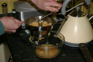 Next day, place the juice in a saucepan or preserving pan with three pounds of granulated sugar. Put over a medium heat and stir with a wooden spoon until the sugar has dissolved. Remove the spoon and turn the heat up so that the fruity syrup boils enthusiastically. At this point put a saucer in the freezer so you can test for a set later.