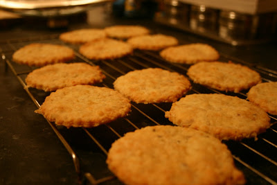 To attain really thin oatcakes, Jane suggests slapping them ‘between your oatmealy hands. I tried this but it was difficult. I found it much easier to roll and cut out circles, then rolling the circles separately on the board. They weren’t perfectly circular, but they were very thin and crisp. The mixture made me 16 good-sized oatcakes.
