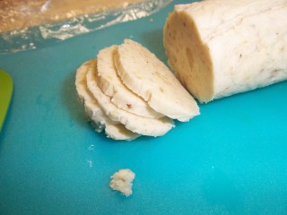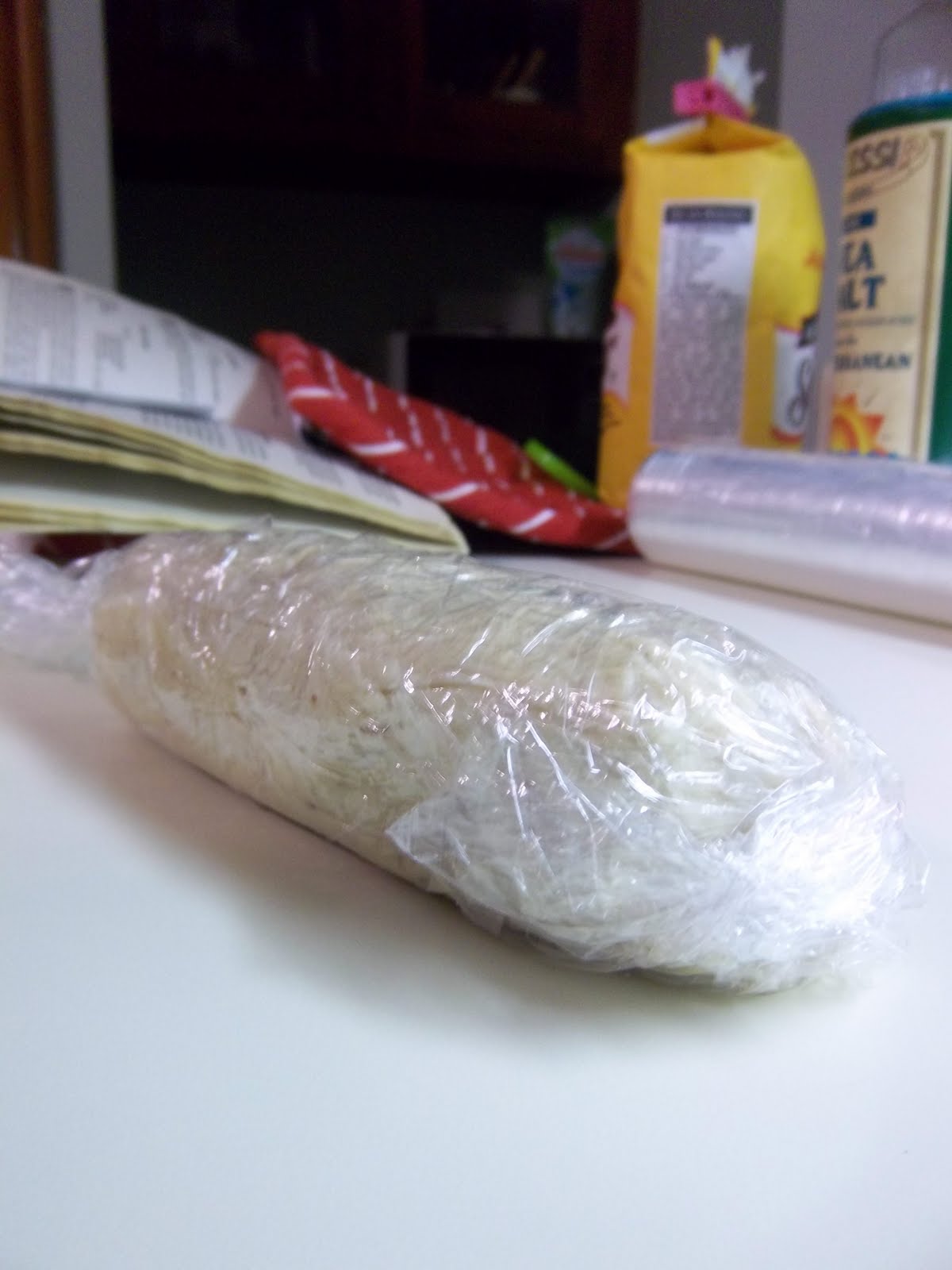 Repeat with the rest of the mixture. Put the sausages of dough in the fridge to harden up over-night. You can freeze them like this too.