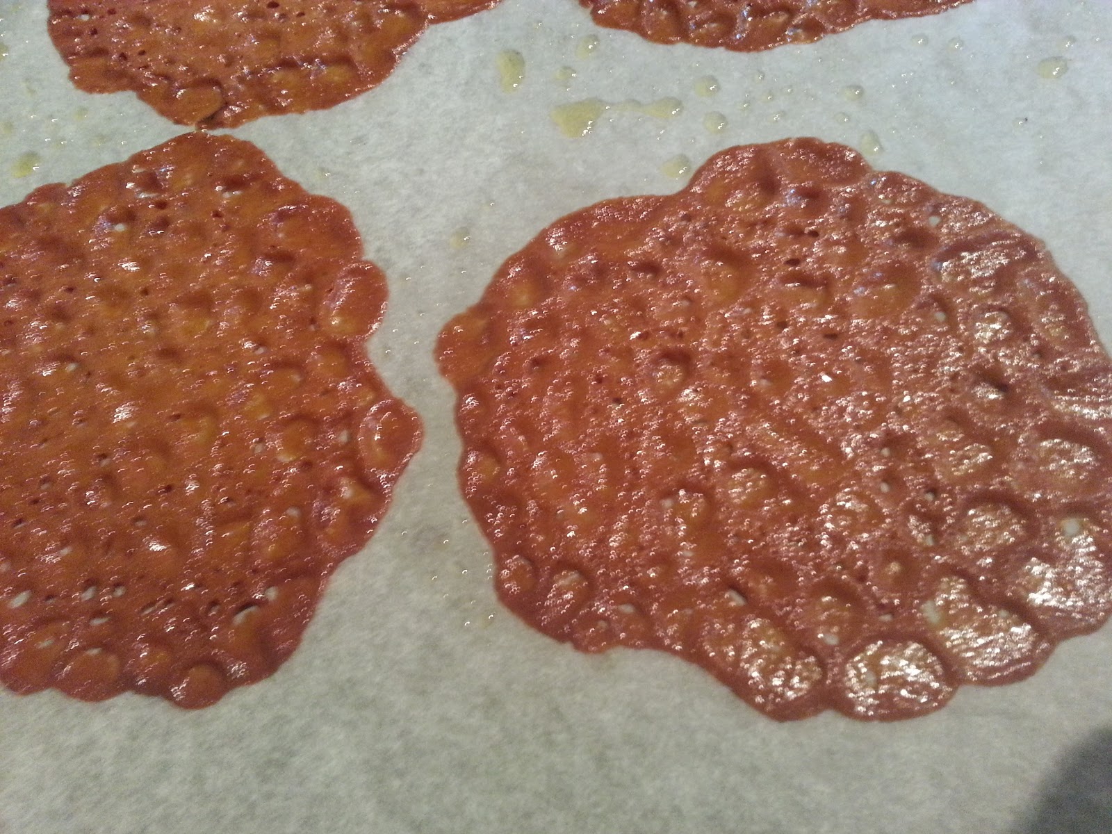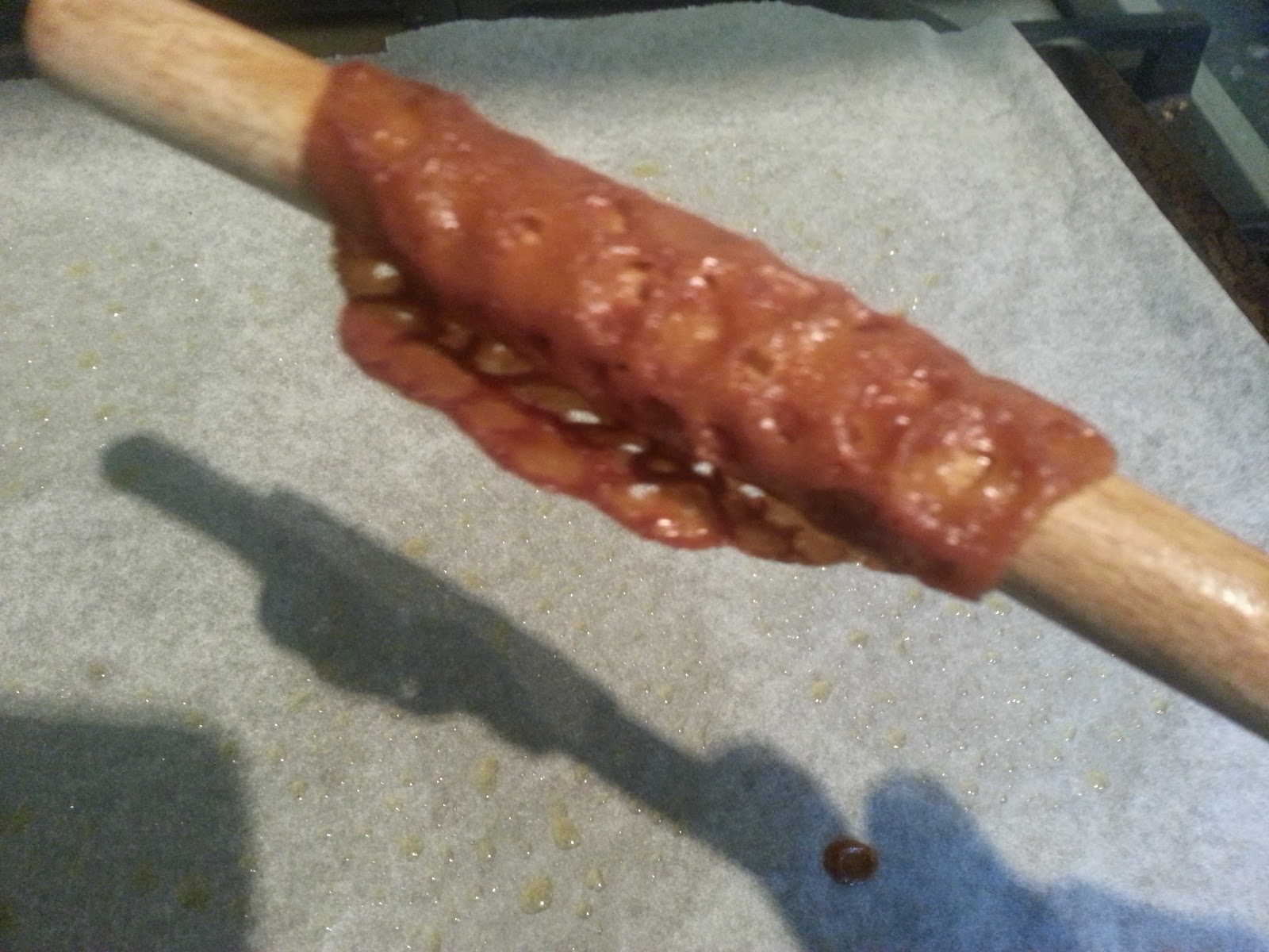 Don’t fear the brandy snap, it turns out they are not as difficult to make as people say, though a little patience is required for the first few before you get into your stride: too hot and they tear (and burn!), too cool and they cannot be shaped and break. Do them one at a time and if the others get too cool, pop them back in the oven for a few seconds to soften again. No probs!