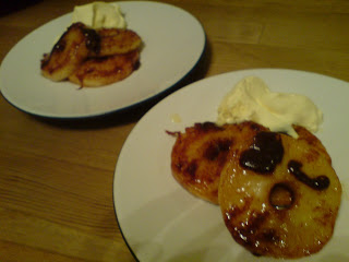 Peel and core one apple per person top and tail them and cut into three thickish rounds. Fry the apples on a low to medium heat in butter until they start picking up a faint golden colour. Whilst that’s happening make some cinnamon sugar; one tablespoon of sugar to one teaspoon of cinnamon. I found that this was enough for two apples, but you put on whatever amount you like. When the apples are ready, sprinkle over the sugar. Keep the apples turning over every 30 seconds or so and you should magically end up with a nice sweet glaze covering them. It’s important not to have the heat too high, so be careful. Serve them immediately with a dollop of clotted cream. Piece of piss!