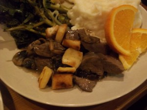 Add a bouquet garni and a pared strip of orange peel (Seville oranges would be great if you can get them) and simmer for 20 minutes, to make a thick sauce. Pass the sauce through a sieve and add ¼ pint of red or white wine and 4 ounces of mushrooms that have been fried in butter. Season with salt, pepper and lemon juice. Simmer for a further 5 minutes, then add the game and simmer very gently again for 10 more minutes. Add a little cayenne pepper. Serve with orange wedges and croûtons fried in butter.