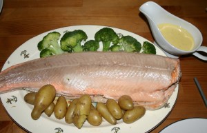 This will serve 3 or 4 people, depending upon the size of your piece of halibut, which should weigh between 1 and 1 ½ pounds. Try and get hold of a steak, if you can only get fillets buy two pieces and sit them on top of each other. Make the spiced butter by mashing together 4 ounces of softened butter and a very generous heaped teaspoon of Patum Peperium and smear it over the halibut, including the underside. Sprinkle over 6 tablespoons of white breadcrumbs and bake in the oven for 30 minutes at 190⁰C (375⁰F) until the breadcrumbs have browned.