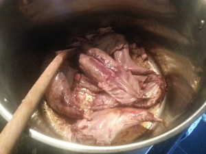 Using a very sharp knife and poultry shears bone the turkey, goose, chicken, partridge and woodpigeon. Begin by cutting out the birds’ spines with the shears, then cut away from the carcass. Don’t worry about keeping the drumstick or even thigh meat of the partridge or wood pigeon.