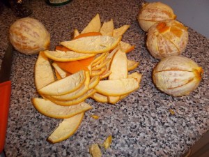 Bring to a boil, cover and simmer gently for 30 to 40 minutes until the peel has softened. Don’t stir the oranges around as they will break up. Meanwhile, in another pan, dissolve 2 ½ pounds of granulated sugar in a pint of white wine vinegar. Add 1 ½ sticks cinnamon, a heaped teaspoon of cloves and 6 blades of mace to the vinegar syrup and boil for a total of 3 or 4 minutes.