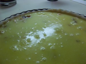 Bake for around 35 to 40 minutes until the top has turned a delicious golden brown. The tart will rise in the oven, but then sink when you take it out. Griggers says to eat it warm with cream, but it was pretty good with some nice vanilla ice cream too.