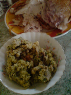 Next, I prepared the stuffing from 2 very large bunches of parsley, stalks and all, plus two, trimmed and cleaned, leeks. (Jane gives an alternative to the leeks in the form of 2 bunches of spring onions and a lettuce.) I roughly chopped the greens and put them in my food processor for chopping, along with some fresh thyme and marjoram leaves. Jane also suggested a handful of young raspberry leaves as an optional extra; it’s the wrong time of year for raspberry leaves, so I had to give those a miss. I seasoned the whole thing with ground mace and black pepper and then chopped it all finely – don’t go too far with this, they should be chopped, not made into a paste.